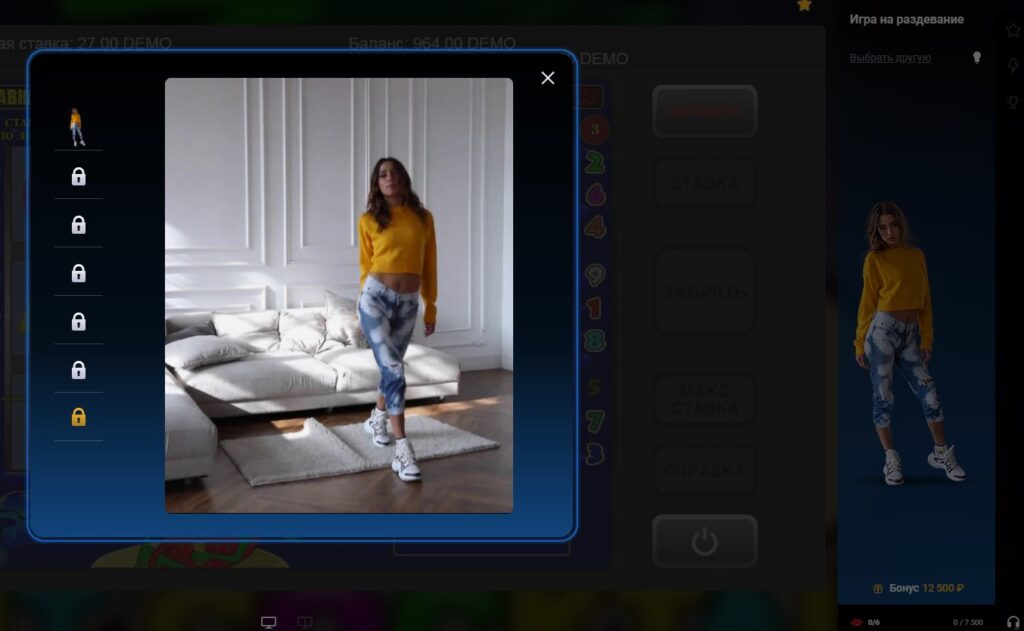 • Игра на раздевание (18+) — позволяет раздевать красивую девушку как бонус к выигрышу